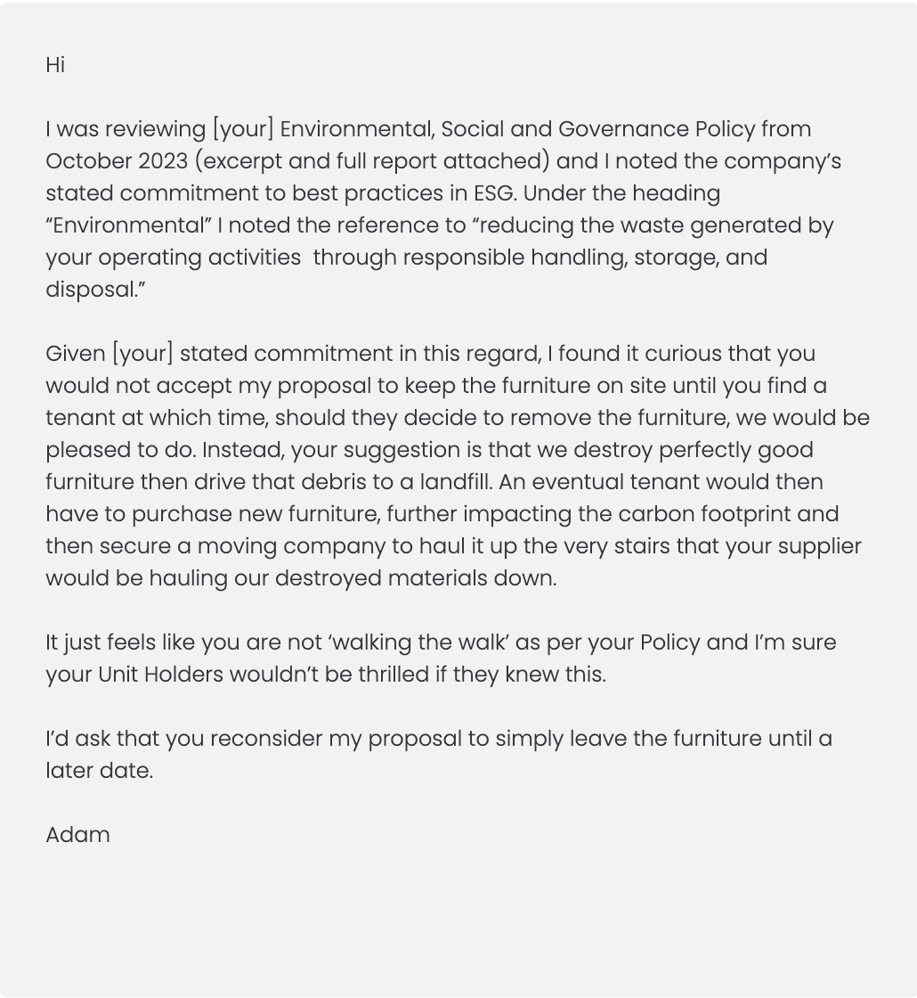 I know this because I’ve spoken with the new tenant; they are my erstwhile upstairs neighbour in the Old Alberta Hotel Building. Oh, and not only did the brutes destroy the furniture I knew about, but they took the sledgehammer to the reception desk, too – despite my pleas to spare it. And so now, the new tenant must find new furniture, a mover to haul it up the stairs, a reception desk to build and a landlord to endure. Hey, at least they have an ESG Policy.