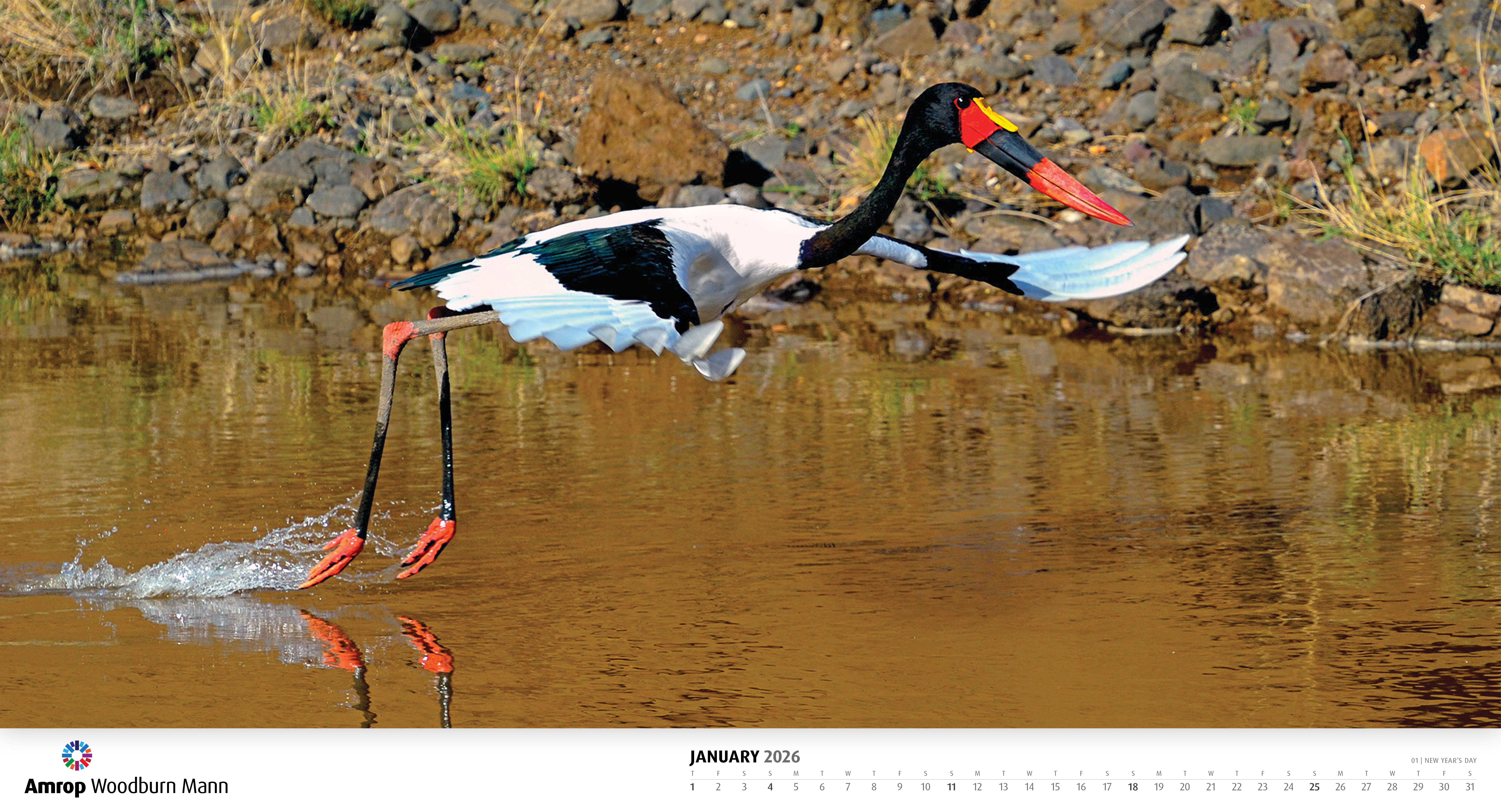 Late afternoon in the Mashatu Game Reserve, Botswana, several Saddle-Billed Storks were fishing in a remaining pool of dry river bed. This particular stork decided that it was satisfied and suddenly launched itself into the air with a huge kick and flap of its wings to get itself airborne.